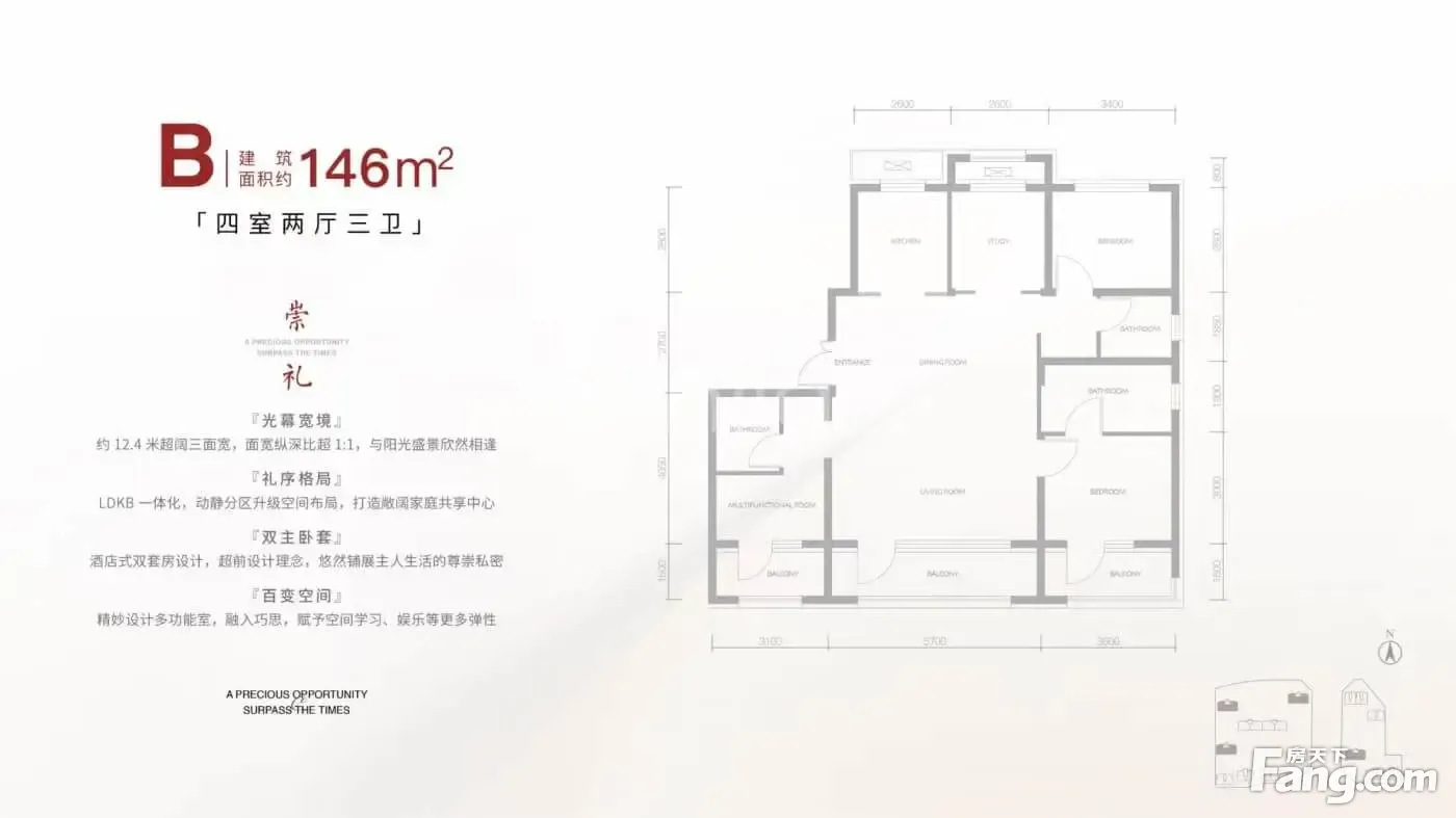 【建面146㎡4居】1408万,4室2厅3卫, 南·北朝向,