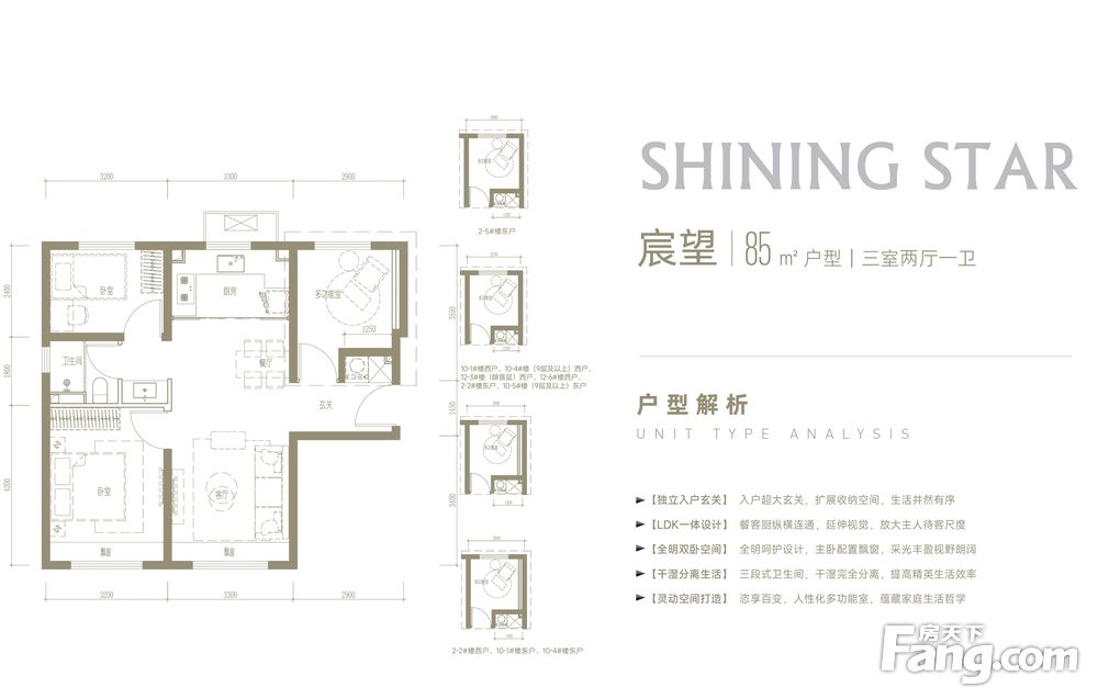 6. 85/99㎡三居室主力户型,刚需到改善选择,精装交付、户型方正合理无浪费空间.
