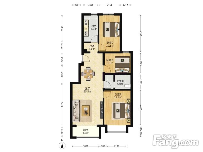 户型介绍本房是小区里主力户型,单卫三居室,主卧室和客厅朝南,一间次卧室朝东,另一间卧室朝北,厨房朝北,卫生间在主卧和次卧中间,布局合理,起居方便