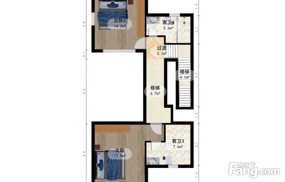 地上二层:一南一北双套房设计带落地采光书房