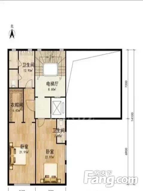 【地上二层】整层实际可利用面积约为93平米,高3.3米。整层由老人起居套房和儿童起居套房所组成。老人起居套由卧室、衣帽间和独立卫生间构成,儿童起居套房,由卧室和独立卫生间构成(挑空空间近18㎡)