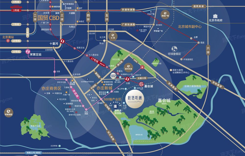桂语听澜选址亦庄台湖版块,地铁17号线首站嘉会湖站,驻守国家科创产业发展重心,金融科创服务中心同时对接朝阳CBD、通州副中心,享亦庄速度发展下价值红利。