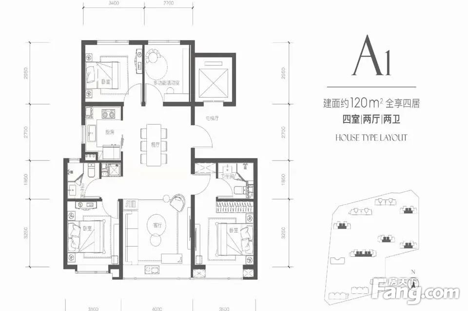 阔朗四室,灵动格局;南向套房式主卧,奢配卫浴;随心可变多功能室;南向多飘窗,光幕都会天际;