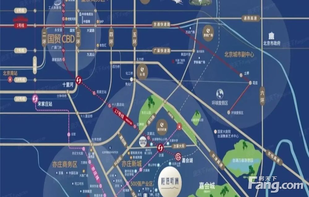 桂语听澜选址亦庄台湖版块,地铁17号线首站嘉会湖站,驻守国家科创产业发展重心,金融科创服务中心同时对接朝阳CBD、通州副中心,享亦庄速度发展下价值红利。