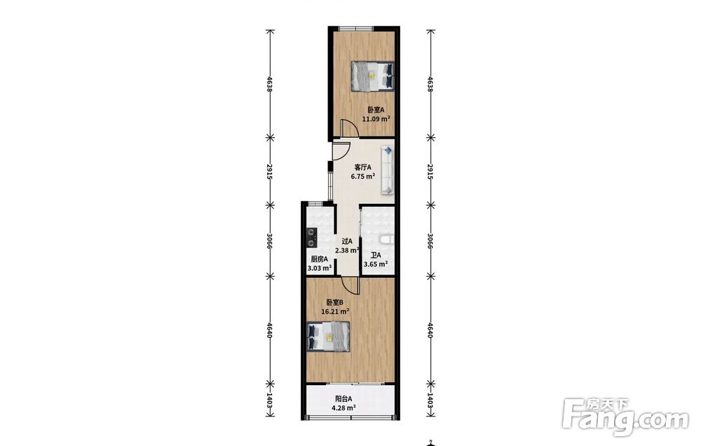 此房户型为2室1厅1卫,主卧朝南带阳台,厨房和卫生间在中间,次卧朝北,空间布局合理。