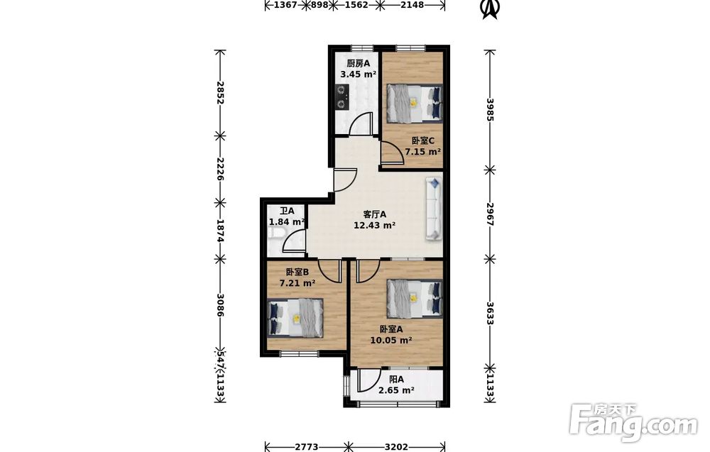 此房户型为3室1厅1卫,建筑面积为67.84平米,朝向为南北。