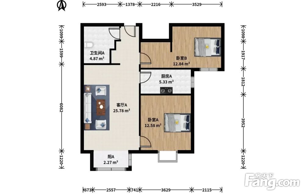 此房户型为2室1厅1卫,建筑面积为83.99平米,朝向为南。