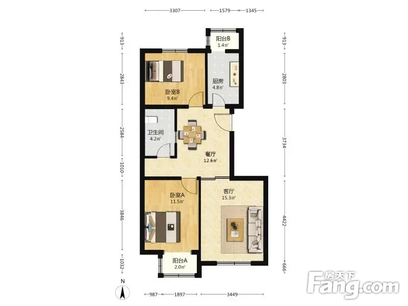 此房户型为2室2厅1卫,建筑面积为86.97平米,朝向为南北。