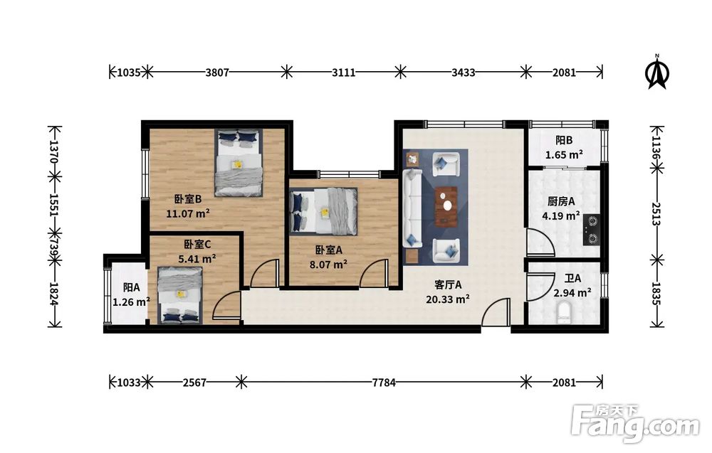 此房户型为3室1厅1卫,建筑面积为90.17平米,朝向为西北。
