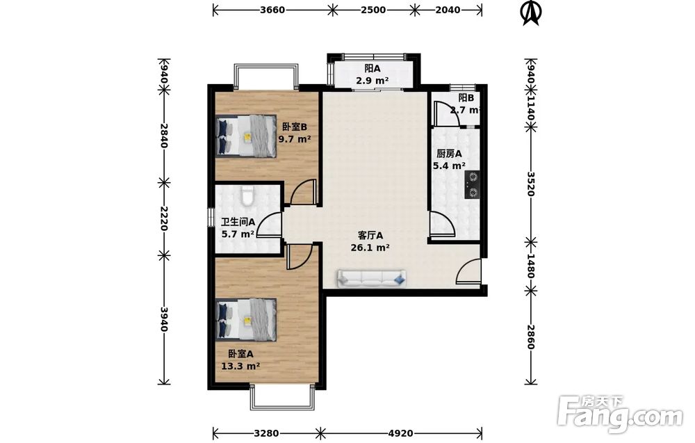 此房户型为2室1厅1卫,建筑面积为85.98平米,朝向为南北。
