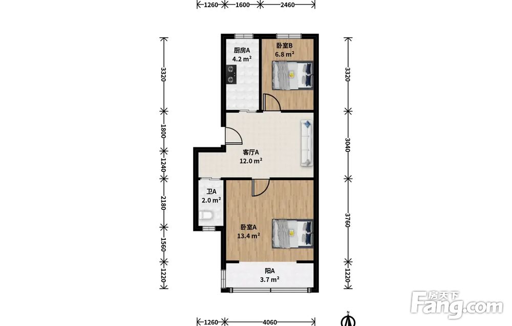 此房户型为2室1厅1卫,建筑面积为57.77平米,朝向为南北。