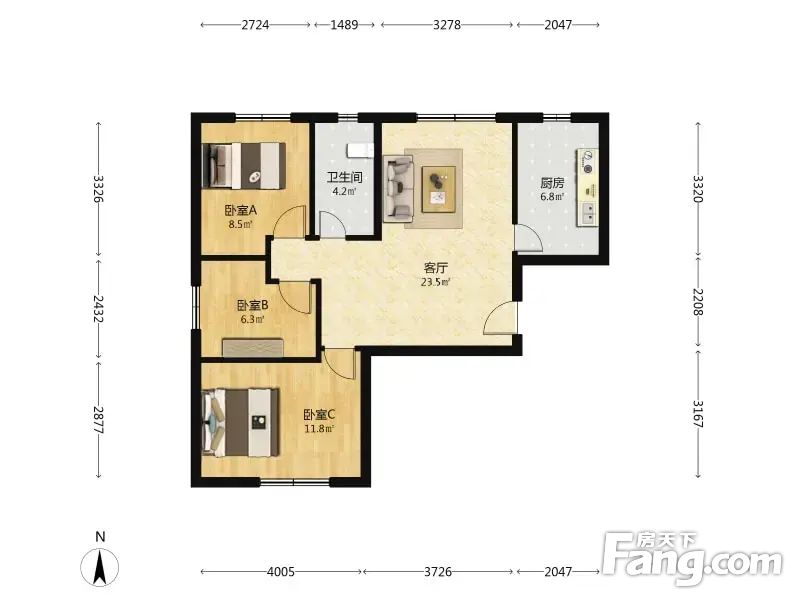 户型介绍房子是南北正规的三居室,主卧室朝南,客厅次卧朝北,户型方正,居住舒适。