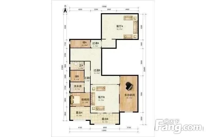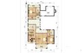 前二后三,C字形户型。5居室设计: 1.一层入户层是北向东侧是一间会客厅,家里有客人可以在此接待。西侧是公用卫生间和车库,南侧中间是大客厅、西侧是餐厅、厨房,东侧还有一间老人房; 2.二层是可以是主卧套,再加两个次卧,南侧有阳台,阳光满满,视野开阔。 3.负一层南侧为休闲娱乐厅,有阿姨房和洗衣房。 4.层,整层空置