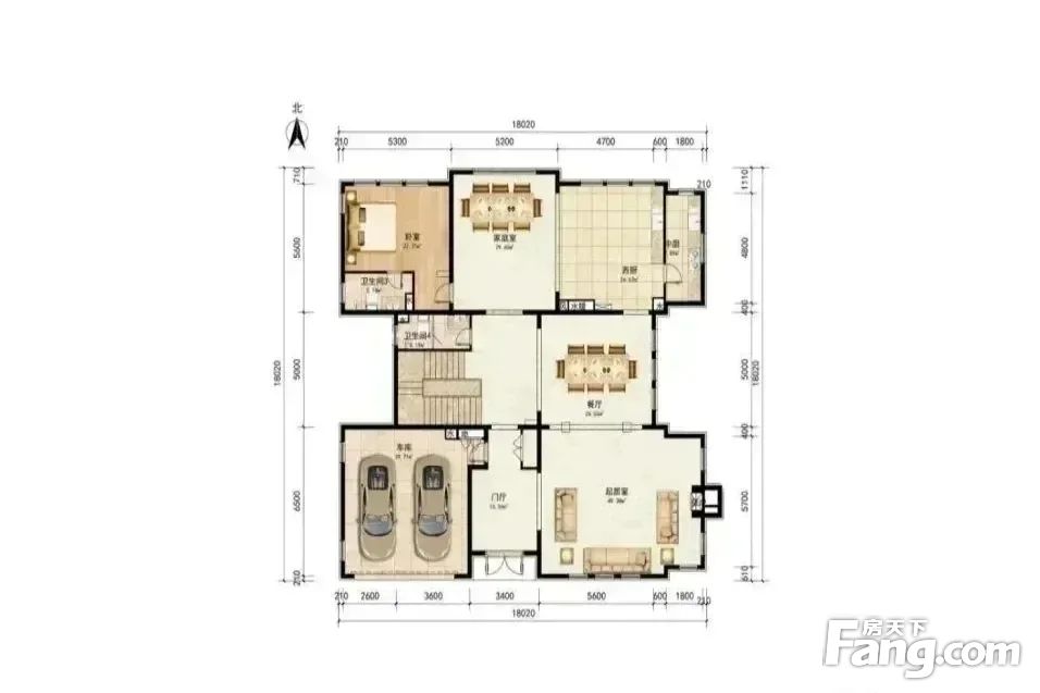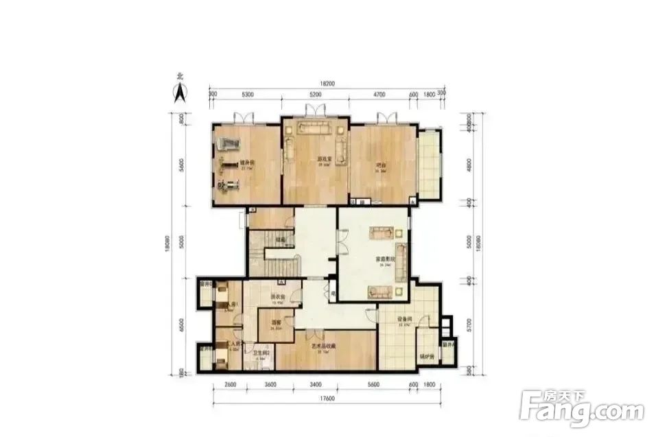 首层带两个挑空,入户玄关8米挑空,北向客厅带9米挑空,采光充足,另一层南向带接待室,壁炉 管道都已做好,南向室内车库可停两辆车,西北向为一间套房设计; 二层为居住区域,共有三间套房,其中主卧卧室面积有40㎡,南北通透的大主卧设计;另外两间卧室一间朝南,一间朝北,均为套房设计,卧室窗户均为大落地窗,采光充足; B1层主要为休闲空间空间,两间阿姨房、酒窖、影院均在B1层,还可以将一层的中西厨和餐厅下沉到B1层。