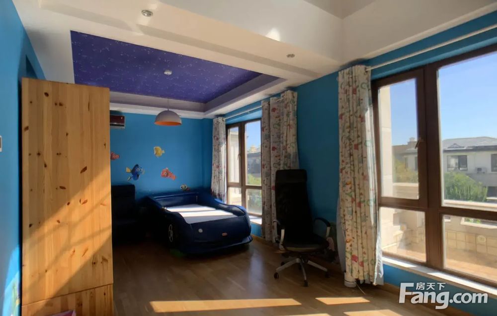 总面积1000平,户型方方正正,坐北朝南,前二后三格局,单层面积330平。 一层客厅挑高7米,中西双厨设计,大餐厅,还有两个南向房间。 二层5个大卧室,一个南北通透+两南两北,有玻璃房。 地下一层有影音室、儿童娱乐室、桑拿房、榻榻米房等。 前院有一个双车位车库,院里还可停两辆车。