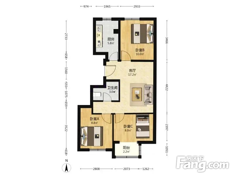 此房为南北向2室1厅1厨1卫1阳,建筑面积79.64平米。