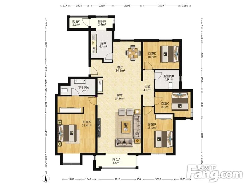 此房是南北通透的大四居,房子采光视野都没问题,三个卧室和客厅朝南,采光面大,位置好