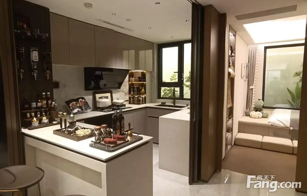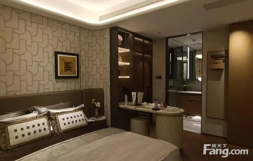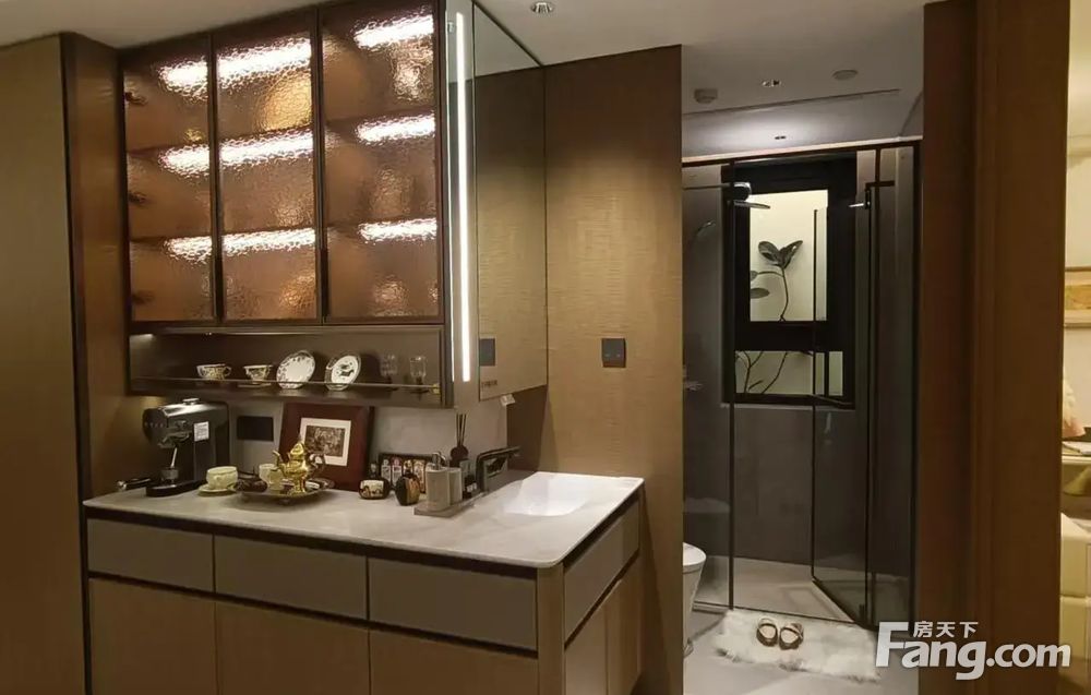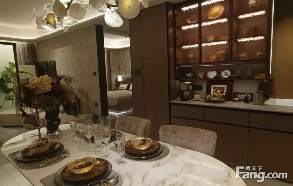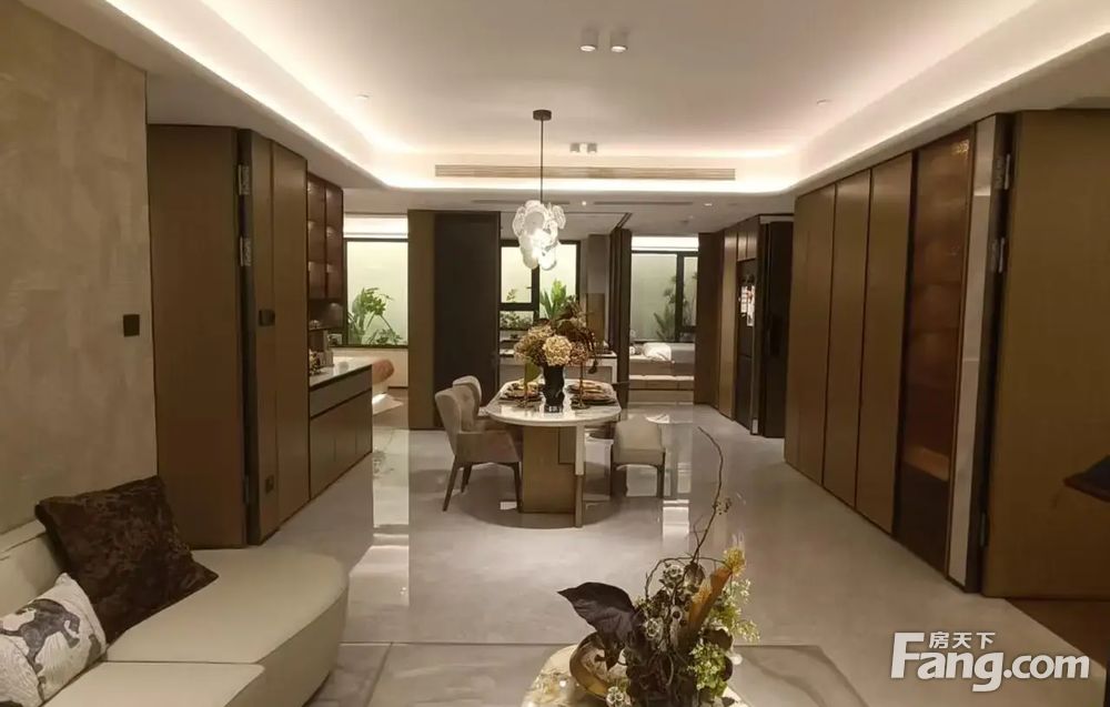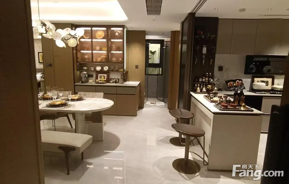 4.收纳与精装诚意足:全屋隐藏式收纳系统,餐厅两侧多组柜子+独立玄关柜+全能家政间,轻松容纳杂物、洗烘套装等;精装标准达5000元/㎡,标配中央空调、新风系统、方太厨具、科勒卫浴等一线品牌,还含防雾浴室镜、静音门锁等实用细节。