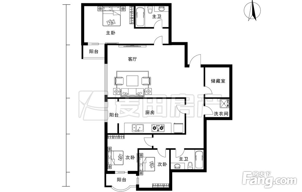主卧客厅朝南,两个次卧和厨房朝北,南北通透客厅带一个6.4平的外置阳台,客厅面宽4.8米,主卧面积17.8平,北向大次卧13.7平,次卧9.7平L型厨房大约15平