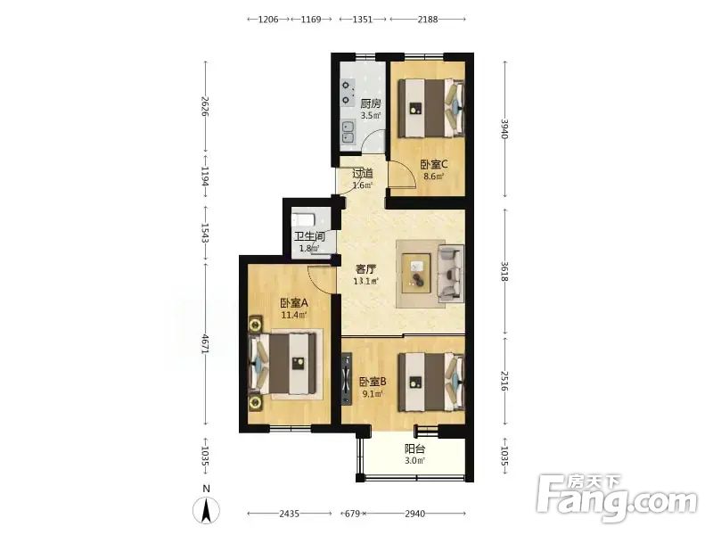(客户0)永定路85号院 3室1厅 69.1平 南北通透三居