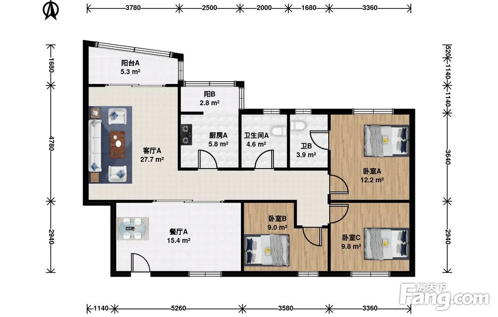此房户型为3室1厅2卫,建筑面积为114.39平米,朝向为南北,双明卫
