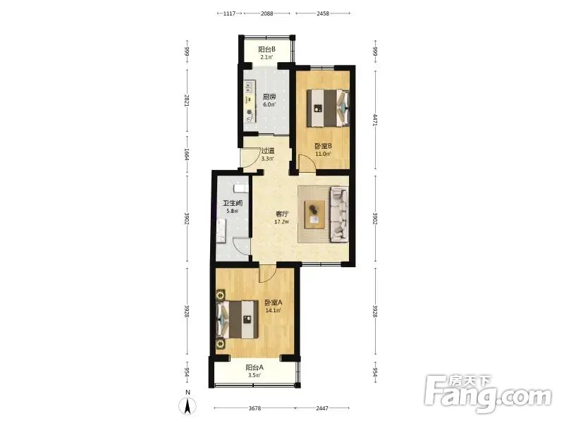 新安里 2室1厅 85.67平 南北通透户型方正客厅宽敞明亮