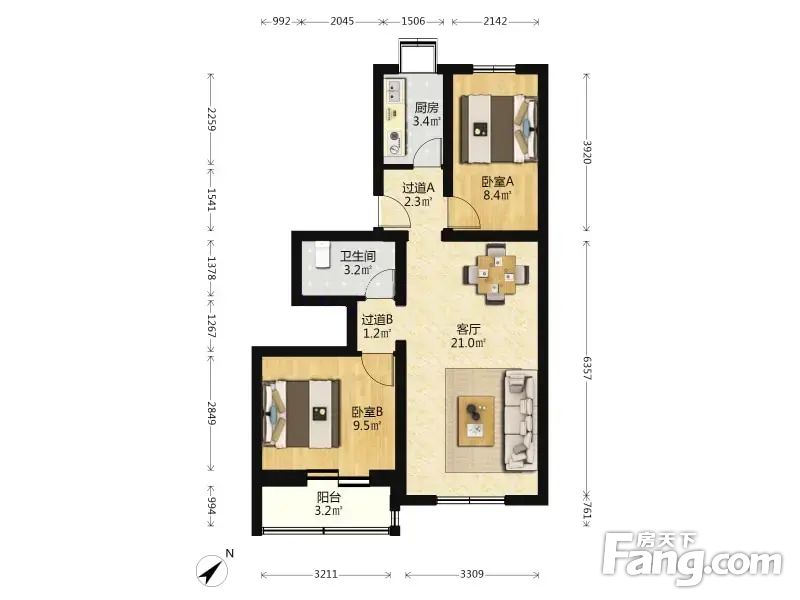滨河西里中区 2室1厅 72.47平 南北通透户型方正采光好