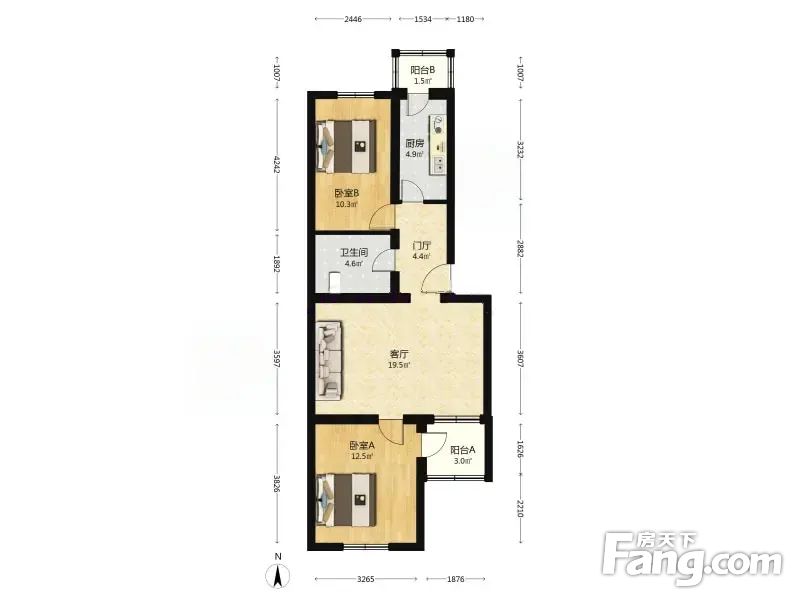 户型介绍房子南北通透,主卧朝南,次卧朝北,客厅带阳台,厨房朝北带阳台,卫生间挨着次卧,户型方正