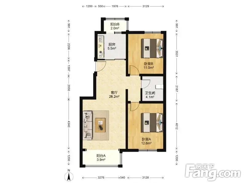 户型介绍南北通透两居室,主卧客厅朝南,客厅落地大阳台,各功能间面积大,利用率高