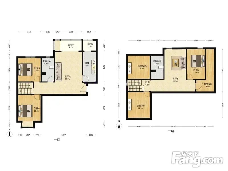 户型介绍上下两层复式结构,上层面积约65平。南北通透,使用面积大,布局合理没有浪费面积。