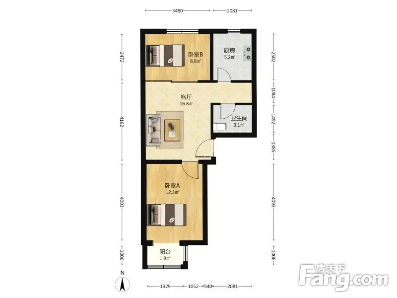 户型介绍房子是南北通透,主卧朝南带阳台,厨房次卧朝北,客厅属于中间厅,房子没有浪费面积,布局合理。