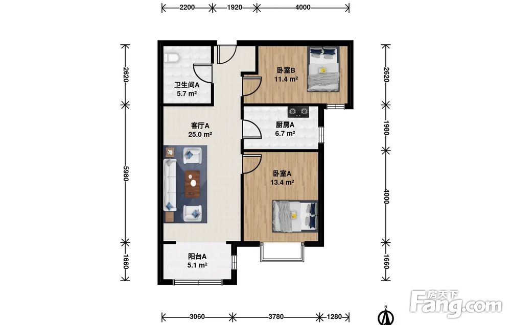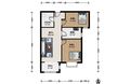 此房户型为2室1厅1卫,三房朝南,客厅带落地阳台