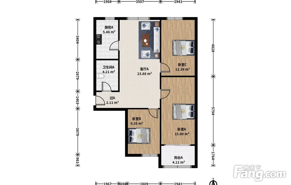 此房户型为3室1厅1卫,建筑面积为107.94平米,朝向为南北。客厅朝北正对着公园,只有这个单元视野没有遮挡。双卧朝南,主卧带南阳台,次卧朝北,明厨暗卫。