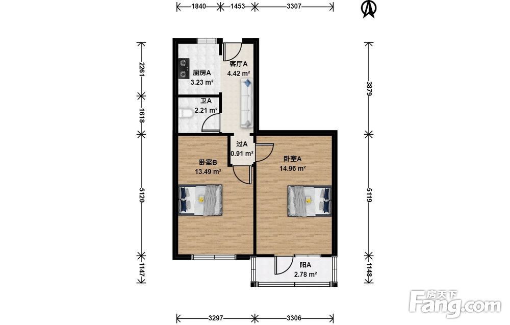 此房为南北通透两居室,户型方正,面积56.2平米