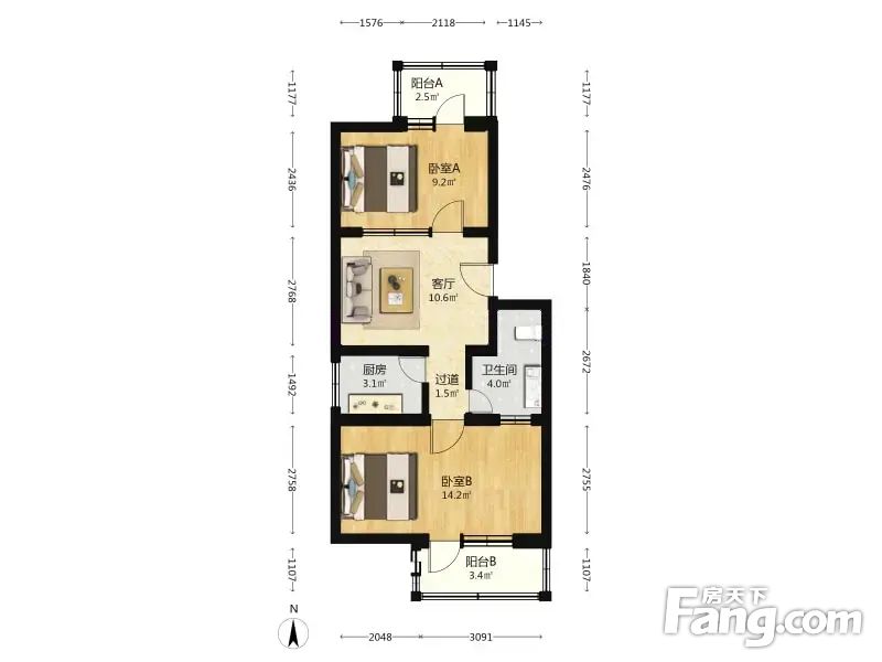 户型介绍:此房南北通透,主卧室朝南带阳台,次卧室朝北,带一个阳台,客厅在中间。