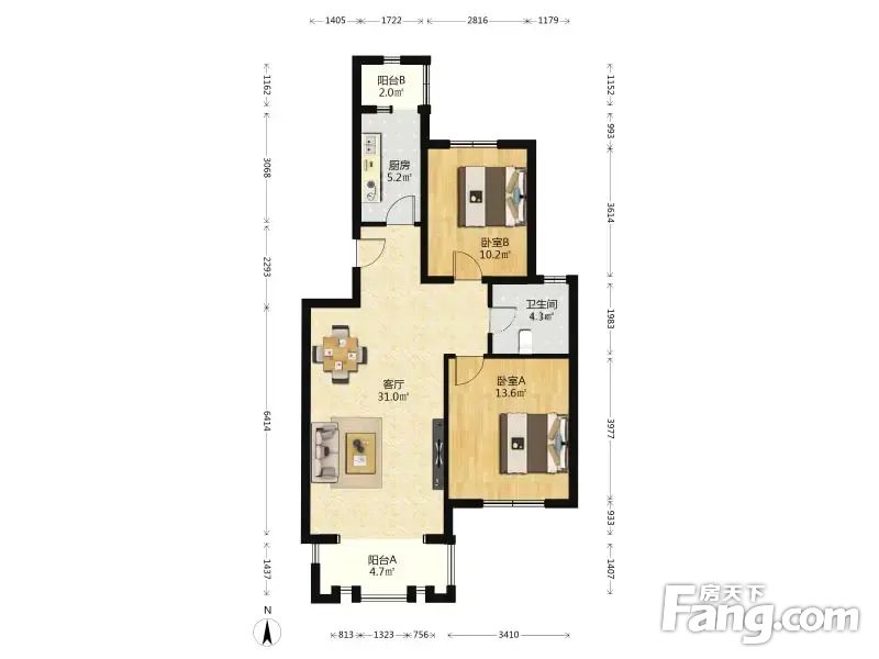 户型介绍户型南北通透属于双通透的格局,进门位置是一个玄关,右手边是客厅大概31平米左右,带一个4.7平米左右的落地窗阳台,厨房带阳台在北侧5.2平米属于长方形,一南一北两个卧室,卫生间明卫有窗户,户型敞亮,通风,便准的H户型。