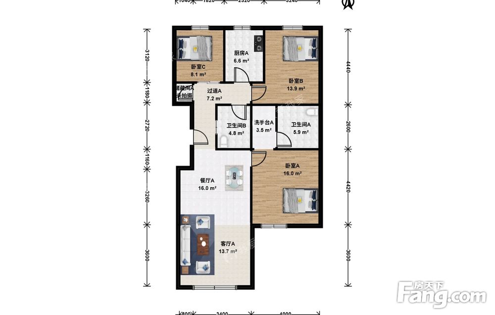 户型介绍:此房户型为3室2厅2卫,建筑面积为120.8平米,朝向为南北。