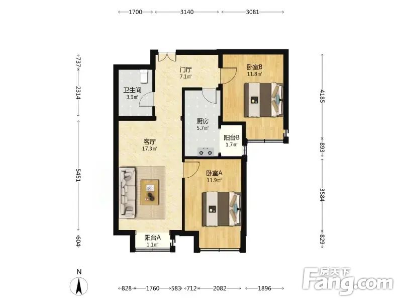 户型介绍此房2011年的房子,全南两居室,此房主卧朝南带有飘窗客厅和次卧朝南,带有飘窗厨房和卫生间的墙体为非承重墙可根据自己需求设计阳光比较充足,