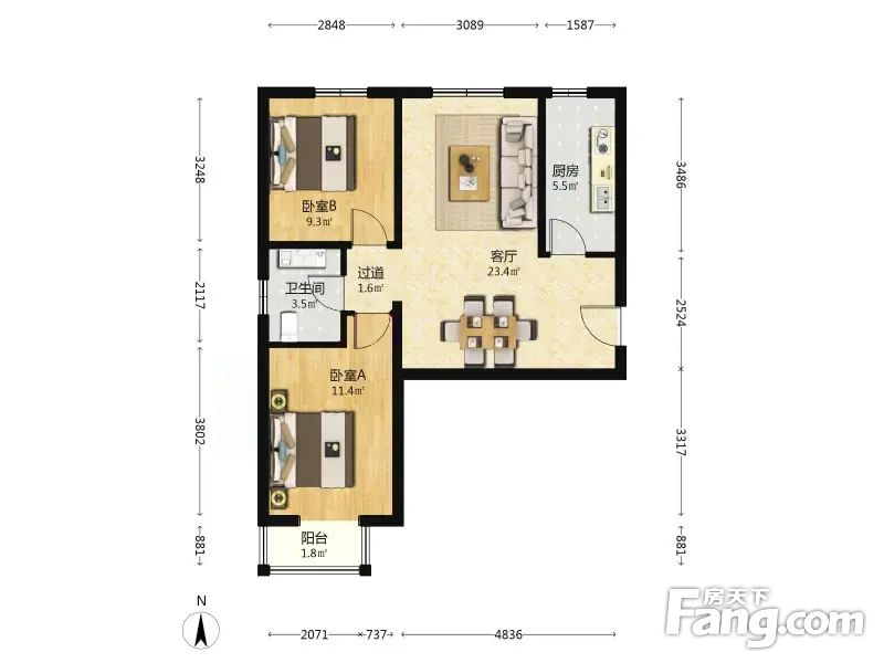 户型介绍房子是南北通透的两居室,房子是主卧朝南带有一个阳台,房子的次卧和客厅朝北,房子的采光和通风比较好,无浪费面积,