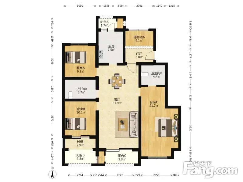 户型介绍此房是南北朝向的三居室,双卧室和客厅朝南,次卧室和厨房朝北,北边门厅外边还有个房间