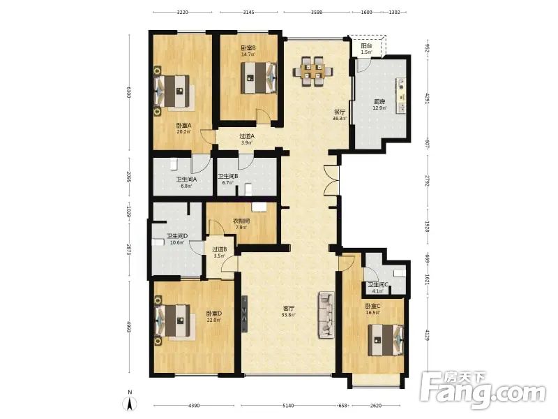 户型介绍户型为4室2厅3卫,双主卧室及客厅朝南,朝小区园林,格局简单划分合理。安静舒适,视野很好,无高层建筑,阳光可满满的照进屋内,而且这个楼的层高为3.3米,层高比别的楼高30公分,地暖,分户空调