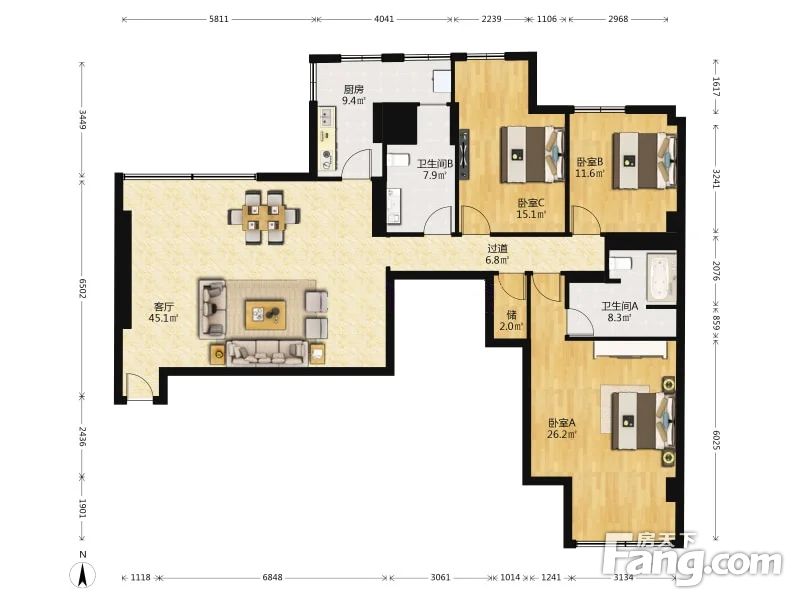 1:178.89平米户型,整个园区只有5套!朝阳首府开售以来出的套这种户型的房子!户型采光好!大厅双卧朝南,卫生间带窗户