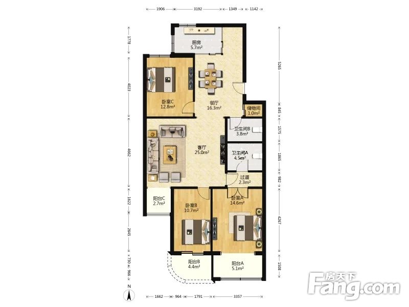 2.户型结构:3室2厅3卫。
