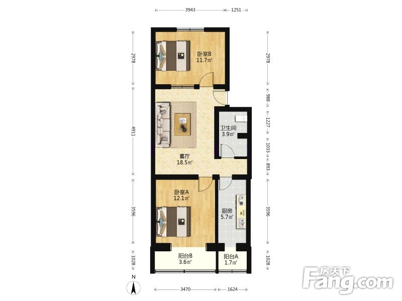 户型:2室1厅 ,朝向:南北,格局方正,使用率超赞
