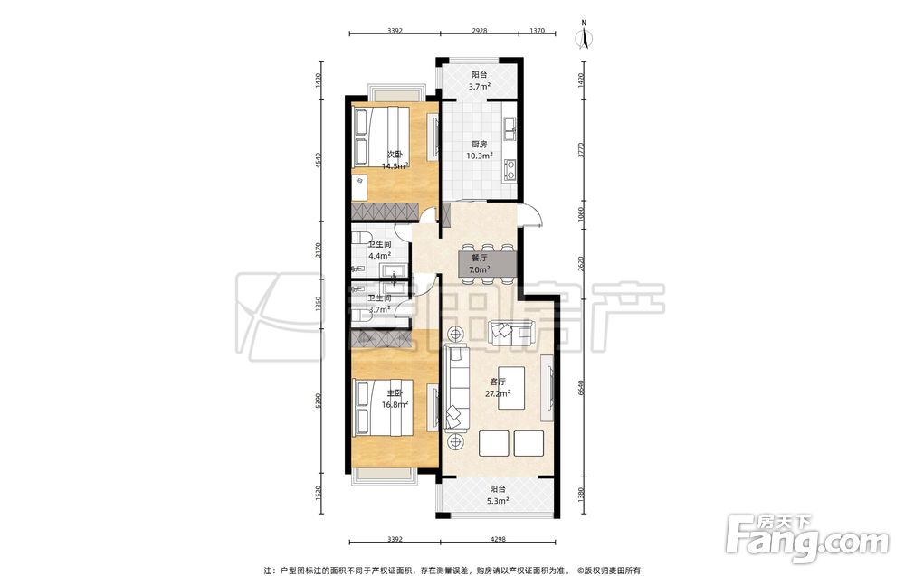 主卧客厅朝南,次卧厨房朝北,南北双线通透,户型方正,实用性强,没有浪费面积