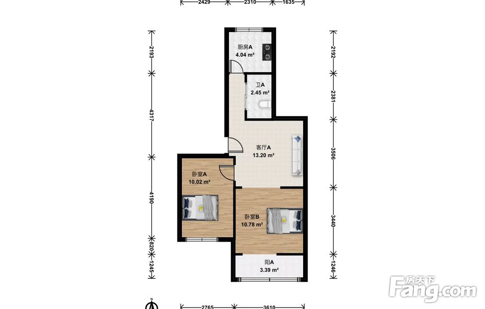此房户型为2室1厅1卫,建筑面积为63.29平米,朝向为南北。