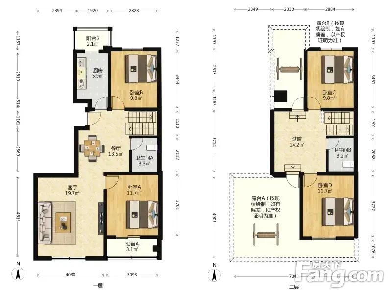 户型介绍河畔丽景本房楼龄2004年,钢混结构,电梯板楼11-12层复式结构,南北通透,户型方正无浪费面积,一层结构是客厅主卧室朝南,厨房,次卧室朝北,二层卧室朝南,南北带两个平台(平台房本平面图有体现),楼上楼下都有卫生间,房子视野开阔,采光无遮
