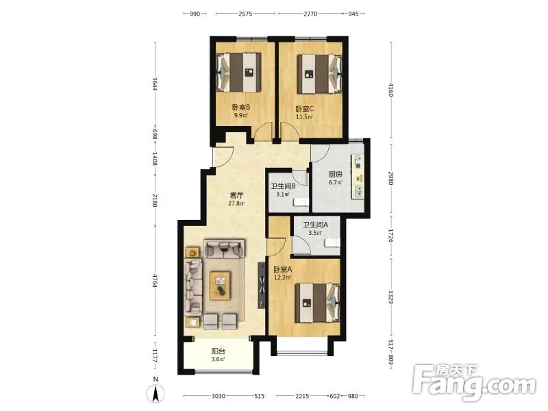 户型:3室2厅 ,朝向:南北,格局方正,使用率超赞