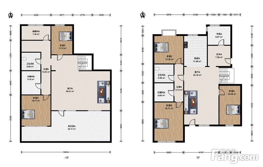房子客厅朝南,一层两个卧室朝南,一个个卧室朝北,双卫生间,厨房朝北,地下一层两个卧室朝南,一个卧室朝北