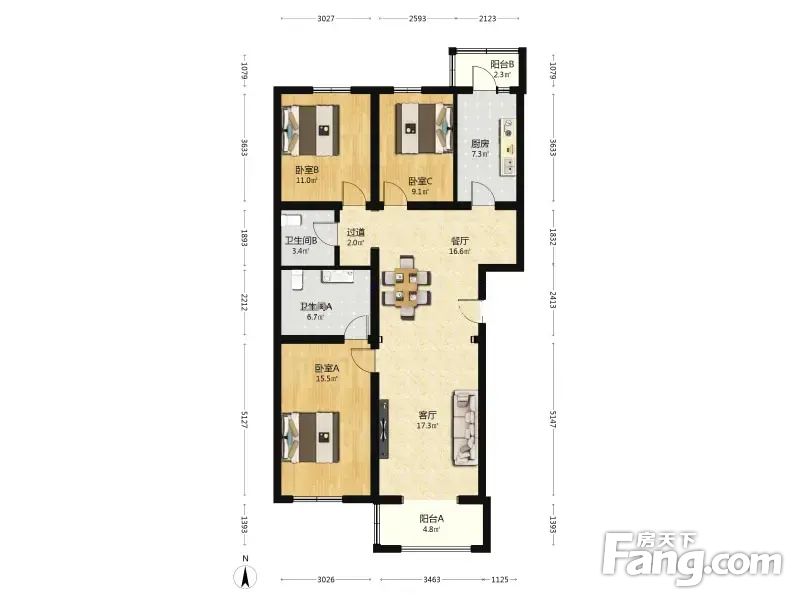 户型简介:标准3房,方正户型,使用率高,采光通风良好。